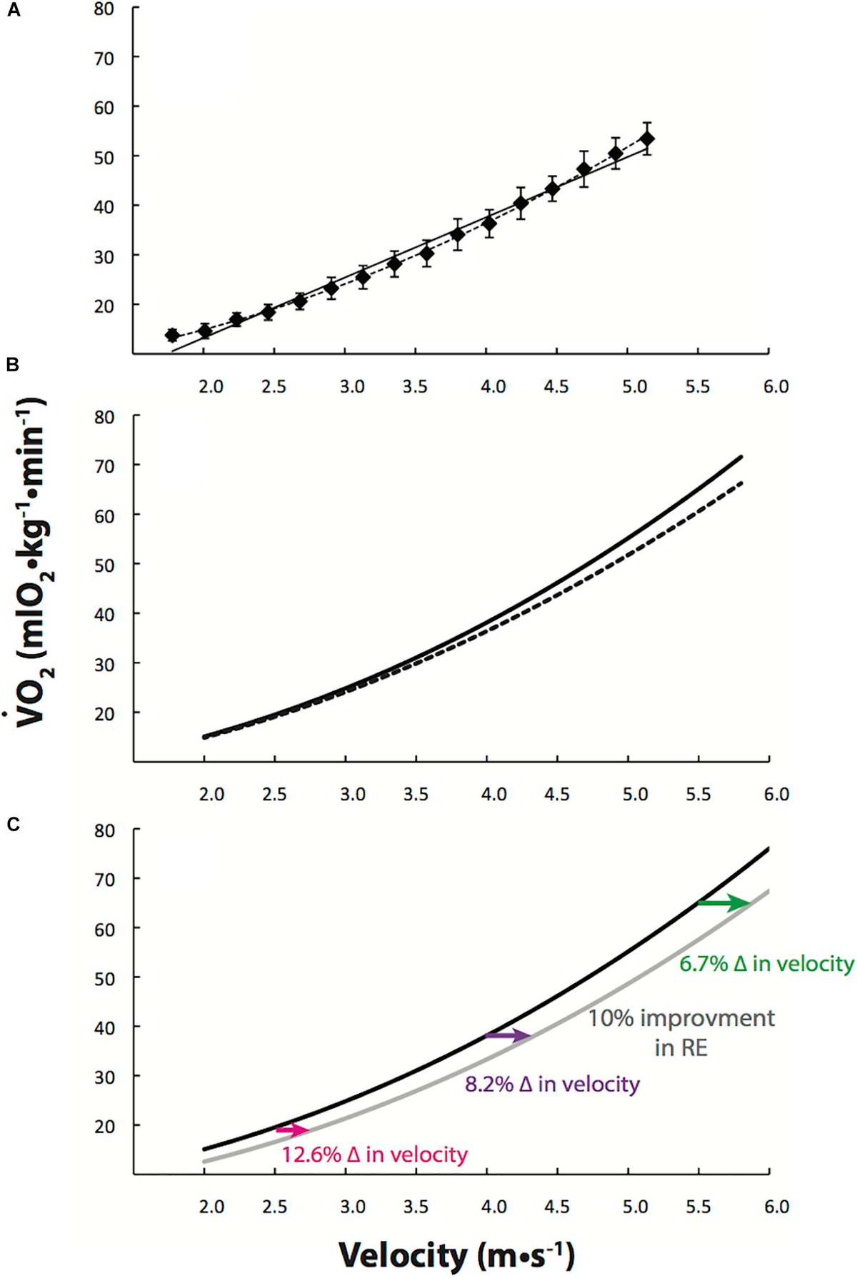この速度とVO2の関係式が線形なら、ランニングエコノミーが1%改善すれば速度も1%改善するわけです。