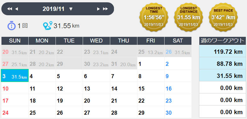 というわけで3週間前の今週末が最適だろうということで、ロング走を中心にした週間練習となりました。そのためポイント練も2回で練習量も4走で95kmほどといつもより少なめです。